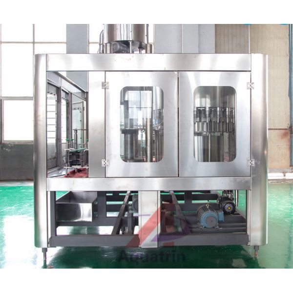 This machine is designed for bottling non-carbonated drinks,such as pure water,mineral water etc, itintegrates bottle washing, filling and capping into one monobloc unit.Suspending bottle-neck clamping design makes bottle stable during the high-speed moving conditions. By changing a few parts, it can meet the need of production of different types of bottles easily.The new generation of stainless steel grab is adopted and the grabs have no contact with the area above the bottle's screw thread. Nozzles in the grab can guarantee the complete wash of the interior of the bottle.The advanced gravity filling technology used in this machine makes the filling quick, steady and accurate.Magnetic torque is used for screw capping, and the power of screw capping can be adjusted steplessly. Capping is reliable and do no harm to the caps.Advanced technologies, such as human-machine interface touch-screen and PLC program control are adopted in this machine.All parts that have direct contact with the water are made of high quality stainless steel. The critical electrical components are from famous international companies, such as Mitsubishi,Omron etc.